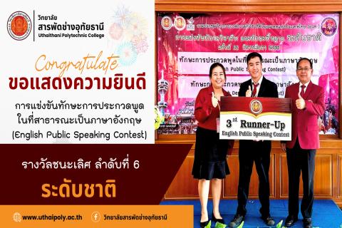 หัวข้อ : ขอแสดงความยินดี กับการแข่งขันทักษะพื้นฐาน การประกวดพูดในที่สาธารณะเป็นภาษาอังกฤษ(English Public Speaking Contest) ระดับ ปวช./ปวส. ประเภท เดี่ยว ที่ได้รับรางวัลชนะเลิศอันดับ 6 :: เข้าชม :: 137