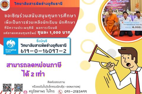 หัวข้อ : ขอเชิญชวน ผู้มีจิตศรัทธา ร่วมสนับสนุนทุนการศึกษา เพื่อเป็นการช่วยเหลือ นักเรียน นักศึกษาที่มีความประพฤติดี ผลการเรียนดีแต่ขาดแคลนทุนทรัพย์ :: เข้าชม :: 315