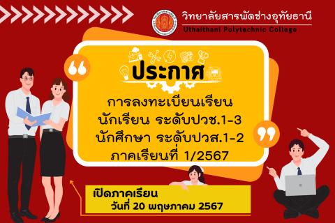 หัวข้อ : ประกาศวิทยาลัยสารพัดช่างอุทัยธานี เรื่องการลงทะเบียนเรียนของนักเรียน ระดับปวช. 1-3 และนักศึกษา ระดับปวส.1-2 ภาคเรียนที่ 1 ปีการศึกษา 2567 :: เข้าชม :: 441